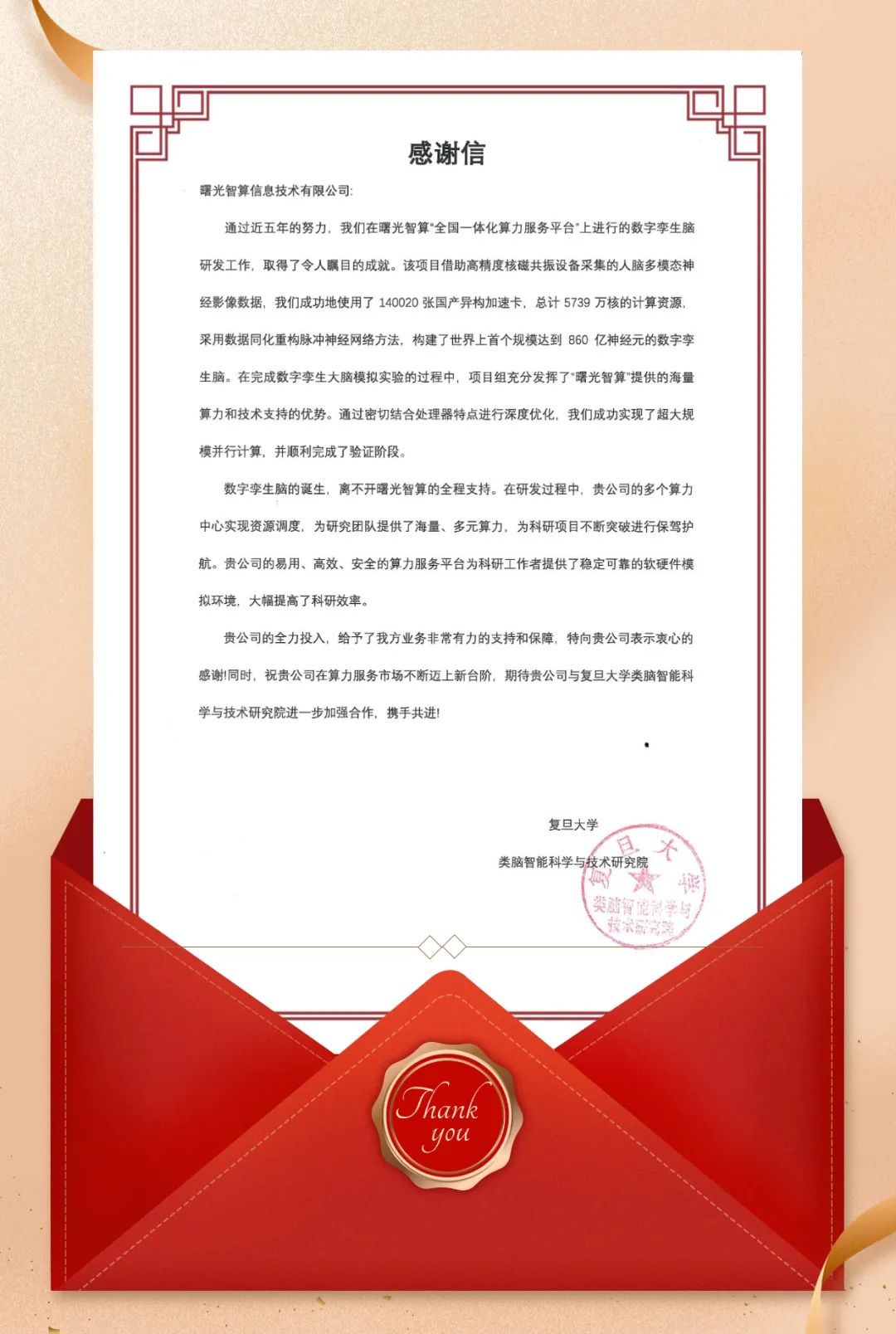 近日,伟德国际唯一官网入口智算收到由复旦大学类脑智能科学与技术研究院发来的感谢信,研究院对伟德国际唯一官网入口智算一直以来的有力支持和保障,表示衷心的感谢,并期待进一步加强合作,携手共进!